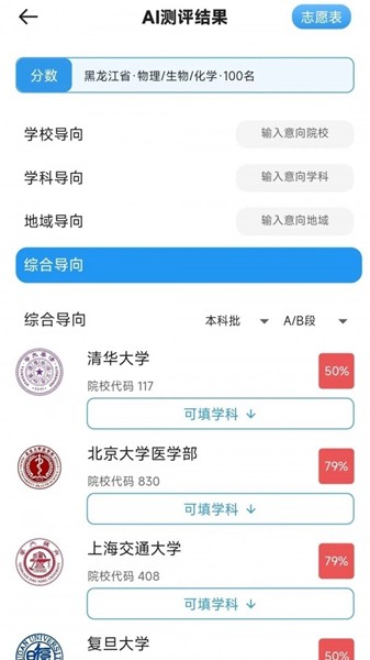 输入高考分,智能匹配录取概率,综合分析录取概率(一分一段/批次),结合历史录取结果,利用大数据平台精确计算录取可能性。