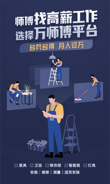 万师傅师傅版app是为安装师傅打造的接单平台,专为安装师傅们量身定制。软件中支持线上抢单功能哦,订单资源众多可以自由选择!海量的家电维修、数码电器等各类设备都可以快速预约上门服务吧!