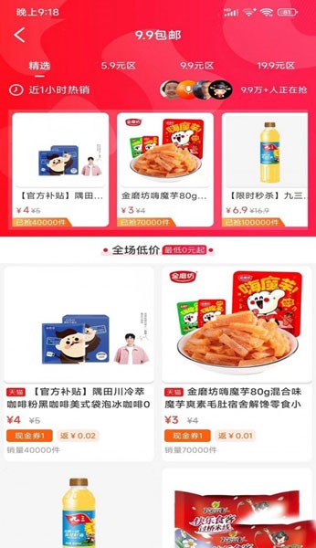 2、9块12包邮:精选低至1元包邮商品,限时抢购,天天秒杀;