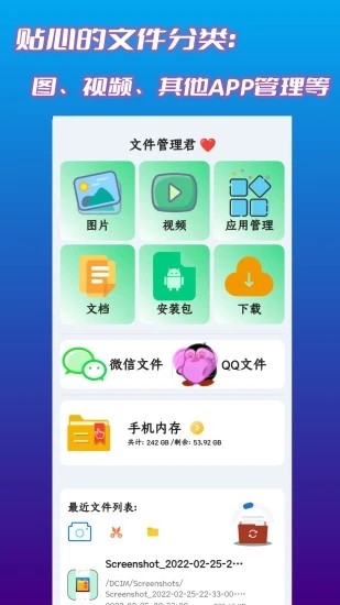 文件管理君是河南省威成科技有限公司开发的一款本地文件分类整理工具。这款文件管理君可以帮助用户快速查找手机里所有的文件,支持对各种文件进行压缩、解压等操作哦,有需要的朋友快来下载吧!