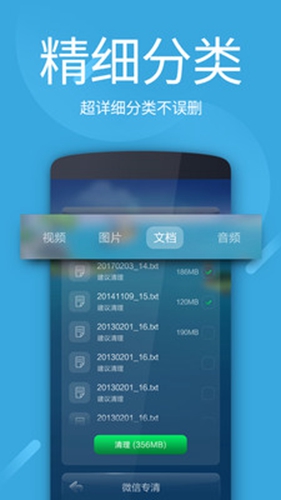 智能识别微信聊天产生的图片、视频、音频等各种文件并进行分析,找到隐藏的清理垃圾。