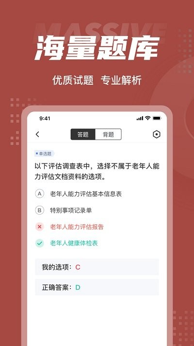 老年人能力评估师题库有模拟考场、顺序练习、随机抽题、背诵记忆等多种学习与做题模式、满足考生各种学习需求。