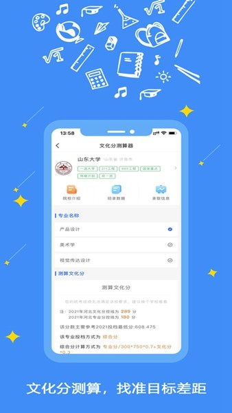 1、智能推荐专业:结合目标专业、大学目标以及成绩筛选出最适合您的艺术类院校与专业。