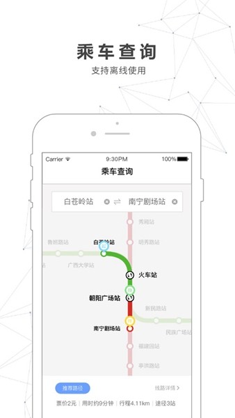 南宁轨道交通是南宁市交通运输局官方APP,具有便捷的一卡通充值及消费管理服务。主要包括:网点分布、路线规划、票价查询、余额不足提示等等;可以方便广大市民随时随地查看到南宁地铁各线路实时动态和车站周边吃喝玩乐设施情况以及公交位置地图数据与换算方案(换算出票号,换计算起点时间);支持在线办理各类地铁业务,