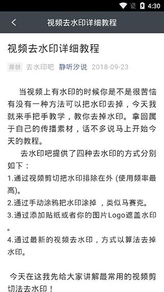 去掉视频中的文字水印和logo的水印,让视频更加有个性、有趣!去水印吧是款图片加视频制作工具,让你的视频变得与众不同!去水印吧是一款强大的去水印应用,可轻松提取各大短视频平台的无水印视频内容。