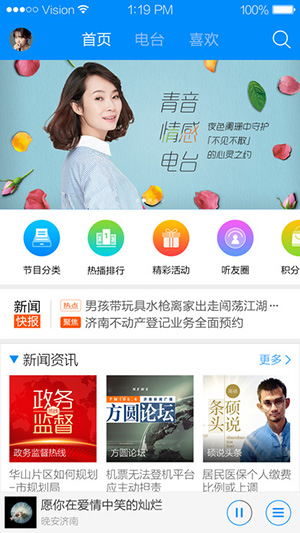“由杭州大湾区广播电视台主办、济南市人民广播电台、山东移动新媒体集团”主营业务。该客户端以移动终端服务为基础,整合广播电视音频资讯及线下便民服务的移动客户端。主要包含新闻动态、新闻发布、视频点播以及音乐等功能模块;