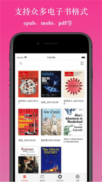 7.“英语学习”:内置丰富的英语学习资源库,覆盖广泛的英语领域,从初级口语到高级英语等级,满足不同用户的学习需求。此外,应用还提供了大量的英文原版图书任你选择,帮助你更好地理解英语单词和句子的特点。