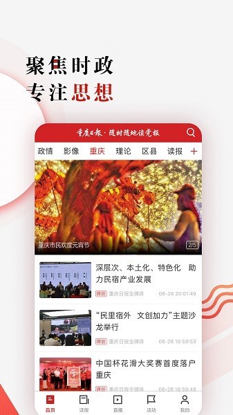 重庆日报是重庆报业传媒有限公司官方推的天津新闻客户端,重庆日报APP是一款由重庆市***主办、重庆报社承办的移动客户端。软件拥有丰富多样的原创资讯内容和权威信息发布渠道,用户可以随时随地查看到最新的新闻报道动态;通过该软件你可以第一时间了解重庆市***发布的各种政策以及公告等消息