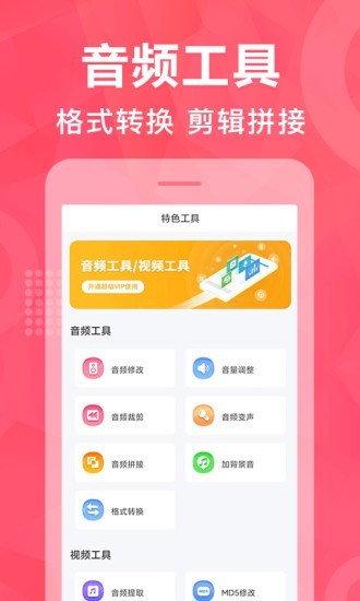 “停顿不延时”、“无缝拼接”、文字转语音、语音合成、语音导出、一键导出MP3、拷贝到U盘或内存卡里观看,视频剪辑合并,视频裁剪,分割倒放,翻转视频,图片添加滤镜,贴纸涂鸦,录制音频。