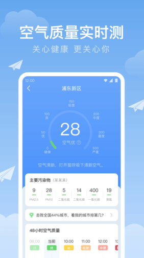 1、实时更新天气信息:实时获取您当前位置的天气预报和空气质量污染物推荐,并提供48项防御措施;