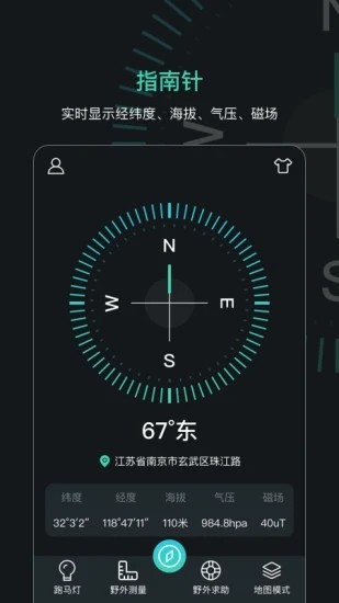 定位指南针以精准的GPS位置信息技术为基础,提供精确的地理位置信息显示(米/英)位置信息展示(浅显易懂),可查看当前位置的实际方向、气压、湿度等关键指标,还可通过手机实现水平仪与地图模式切换,满足您对虚拟世界的一切探索,是目前市面上最专业的户外指南针产品之一