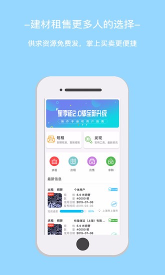 星享租由枝光科技发展买卖软件是一款专为广大的建材商们打造的手机租赁app,这款应用是专门为上海地区用户推出的,在这里有各种不同的建材资源可以进行选择使用,同时还有专业的人员为大家提供在线服务!