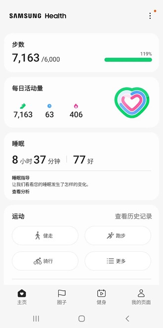 三星健康的软件不仅能显示用户的步数、距离、热量消耗等详细信息,还能通过图表直观展示用户当前的步行距离及消耗卡路里的摄入。这些统计结果也方便用户随时查看和比较自己的锻炼成果。