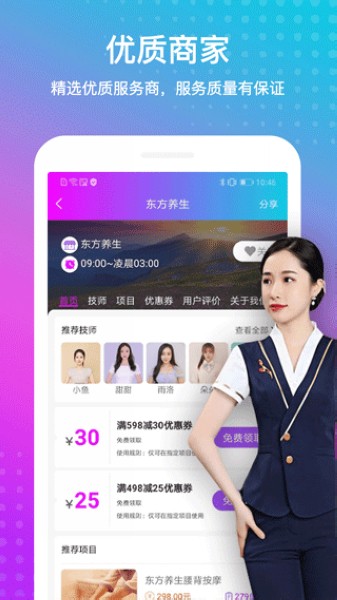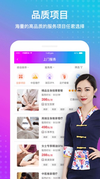 1、提供上门推拿按摩、理疗保健、中医养生等服务项目;2、为广大的用户提供的优质服务都是非常方便快捷的服务内容都可以轻松了解并选择到自己喜欢的类型去享受便捷式线上操作体验方式!3、让大家可以在平台上更加简单的了解到各种专业人士带来的按摩手法哦~4、这里有超多的按摩方法分享让你自由的选择使用,
