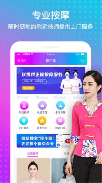 按个摩由深圳凸显网络科技有限公司打造的按摩服务软件,用户可以在线预约按摩,专业的技师上门进行按摩,足不出户就能得到按摩,随时随地想按摩就按摩,还可以通过平台发布自己的动态信息和生活趣事。