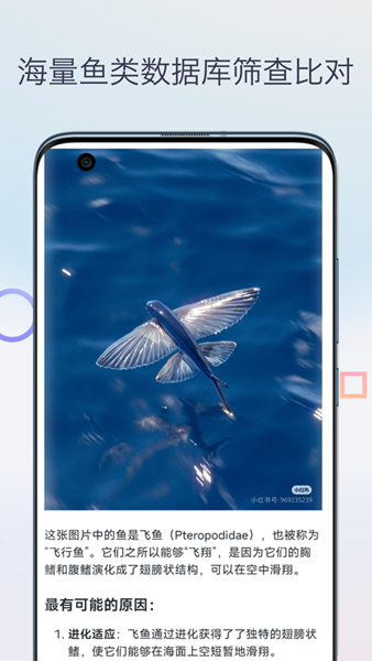 一个专业的鱼类识别软件,它可以让你随时随地轻松了解身边各类鱼类的物品,包括但不限于花鸟、动物等多种类型,同时支持多类鱼种精准识别和搜索;此外还提供了丰富的鱼种种类以及详细的鱼情描述说明等等内容服务供你查看学习参考哦!