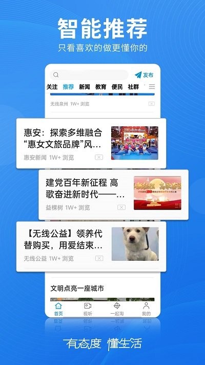 【头条】每日24小时不间断更新,聚焦泉州本地,你关心的身边事就是头条;国内外重大事件及时推送,助您实时了解周边动态。【视频】精选推荐精彩视频,还可随意切换清晰度和播放速度,给用户带来不一样的精彩体验。【报料】随时随地上传相关事件的照片和文字数据到微信朋友圈、微博、qq空间,一键分享您的精彩瞬间。