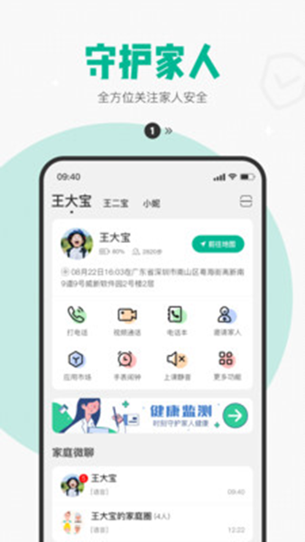 1、随时随地通过手机或平板实时了解孩子的位置信息;2、远程关爱孩子的健康,并及时给予反馈;3、支持远程拨号,语音和文字沟通。4、具有远程求救功能,可以为家庭成员发送紧急联系号码;5、“微聊”功能方便快捷的交流互动;6、【安全区域】提供多种形式的定位服务,保障宝贝的安全。7、“SOS/报警器”;8、【电子围栏】开启APP后,手环会收到短信通知,并且当您在户外时,会收到一条安全消息。9、【运动轨迹】记录宝宝的步数、距离、消耗卡路里等数据,同时可查看历史运动轨迹。10、【地图模式】支持查询附近的医院、学校、公园等,还可添加好友至通讯录内,