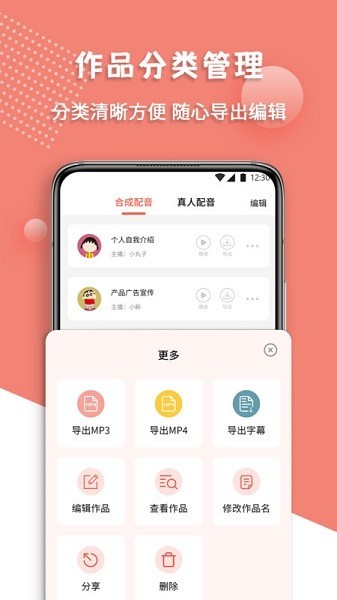 你想要的,我们都有:普通话、粤文、四川话、东北话,英语、日语、韩语、法语等方言,配音王将不断完善内容及功能;我们还推出了更多实用的功能和体验,如视频剪辑、音乐制作、录制音频、多媒体作品发布、图片加字幕、音效添加特效、背景音、变速播放、一键导出mp3、支持多平台分享至好友、QQ、微信等社交媒体平台。