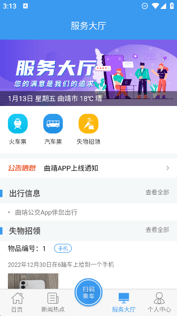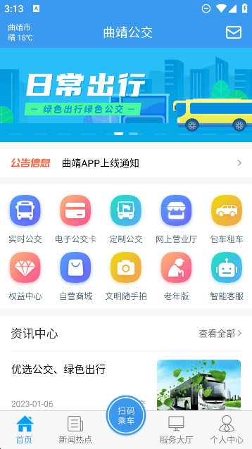 2、进入到最新版本的曲锡市民出行平台之后就可以看到曲昌本地的公交卡充值余额以及当前最新的公交资讯等等的功能模块哦;