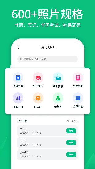 【尺寸齐全】涵盖常用的多种考试报名、学历考试、计算机考试等,根据不同的资格证书需求定制照片打印服务;支持在线冲印功能,免费包邮到家。