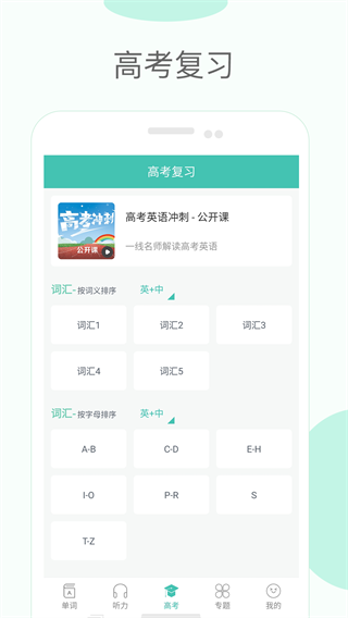 高中英语单词课堂是长沙立语信息有限公司开发的一款面向全国中小学生量身定制的英语学习软件,采用了高频词汇、生僻难句、易错词汇等核心记忆方法,让您轻松高效的记住每一组词汇。