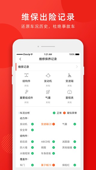 超过300万车主的选择,超过1亿公里质押查询系统:VIN码查询、碰撞识别、事故报告、维防记录、驾驶证查验、违章查询、保养记录等等应有尽有。