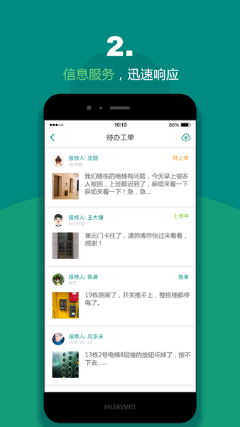 一键呼叫:通过APP快速拨号联系物业客服电话并实现即时通讯(如报修、投诉等)、电子邮件收发以及快递员上门取件等功能。