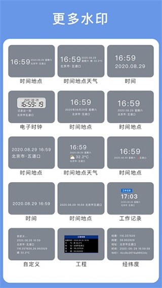 提供文字图片素材添加水印(包括时间、地点、经纬度)、海拔、天气等样式信息并一键保存至云端存储中可随时回看分享或修改自己的工作笔记或者备忘录文件。