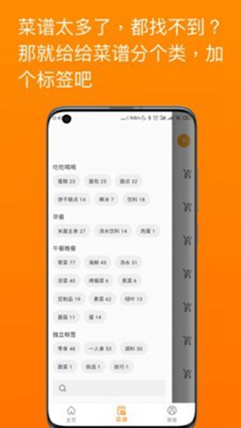 【菜单分类】美食菜品一目了然;分类查找方便快捷;搜索功能精准定位所需菜品;收藏夹随时查看喜爱菜品;添加标签管理每道菜谱都不再错过!