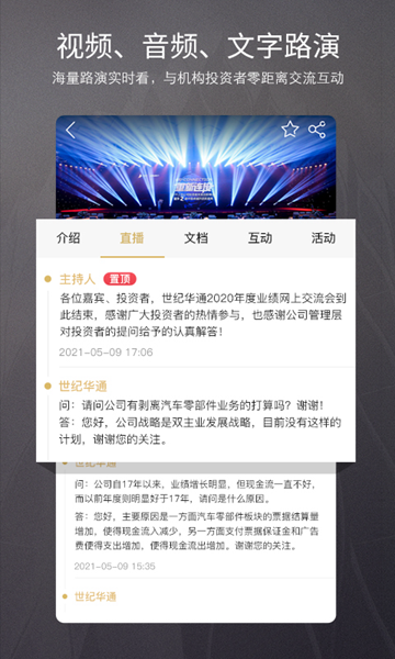 路演中APP一款专为广大投资者打造的股票资讯平台,软件内拥有丰富的股市信息资源和实时行情数据。通过app用户能够了解最新股票交易动态、投资策略分析报告及相关新闻内容等等;同时还能查看到其他投资者所关心的资讯与财经要闻哦。