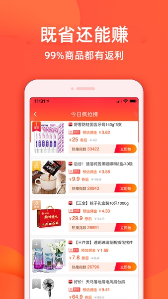 2、每日半价:1元封顶限时抢购,限量商品天天上新;9块10包邮:人工精选百万优惠券任你选;9元秒杀天天有惊喜,超低价错过0元购。