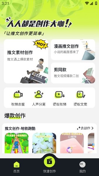 5)推文素材:包括素材商店、原创插画、视频模板、图片涂鸦、字体样式、图片转文字、涂改作业批改作业的功能模块。