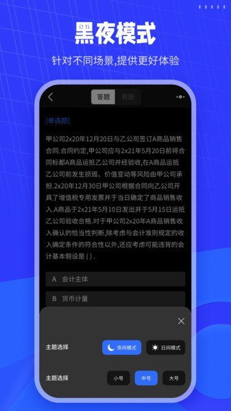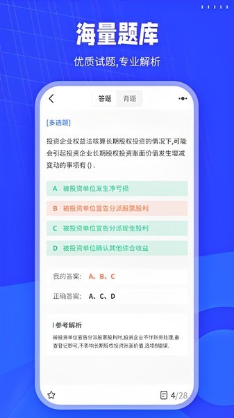 会计刷题软件是一个针对财会资格证考生打造的一款移动刷题神器,覆盖初级、中级、注册会计师考试所有科目,涵盖银行业法律法规与综合能力,个人理财等各专业领域,并根据学员在职场、学历、职业生涯等多个维度生成数据报告,为学员提供精准高效的个性化答疑解惑;同时支持离线下载功能哟。