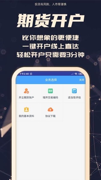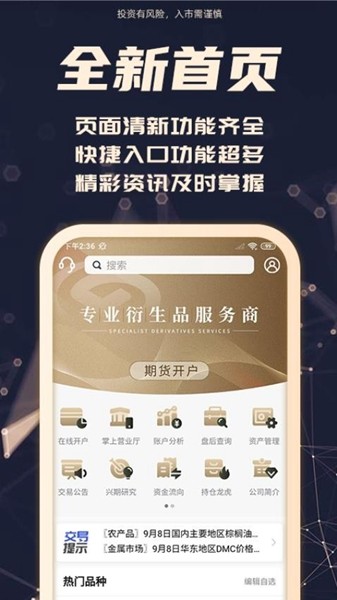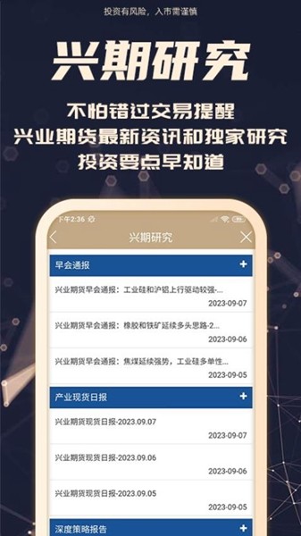 兴行证券APP具备智能开户功能,让投资者能够迅速完成股票账户注册、银行卡绑定与提现;同时还能通过APP办理开户手续或查询营业执照状态以及查看其他业务流程(如转账)、密码修改等相关费用缴纳事务。2D信号技术:依托华中国际先进的行情技术和大数据分析技术,实现实时行情报价及预警提示,帮助投资者做出明智的投资决策;3d信号技术:结合海量模拟交易实盘策略,为投资者提供真实的期货交易环境,提高投资者的资金利用率,降低风险负担;4e投顾服务:提供全方位的投资建议和服务内容,包括投资组合调整、投资计划规划、风险控制等一系列增值服务供投资者选择;5E投研助手:内置了丰富的投资资讯文章库,助力投资者更好地了解市场动态,制定投资决策;:涵盖了多种实用的功能模块,例如持仓单管理、交易记录统计、资产配置方案等等,满足投资者多样化的金融需求;7e投教社区:提供丰富的投资知识分享资源以供参考,帮助投资者深入理解市场动态,建立正确的投资思维。8c基金交易:提供各种优质的财富管理课程可供学习,提升自身财富管理水平,轻松应对不同风险状况。软件亮点