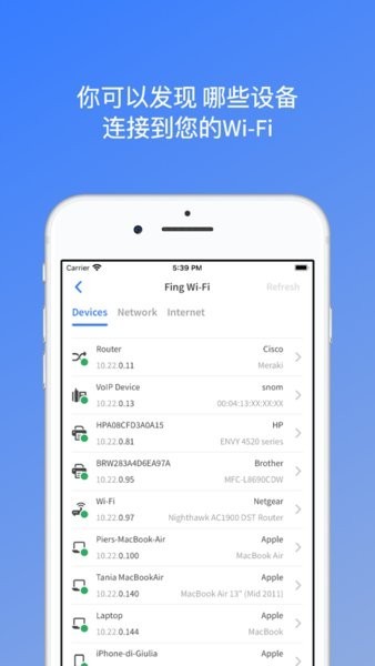 Fing网络扫描仪工具是您选择的一款无线网络检测软件。该功能支持WiFi信号测试、基站扫描、IP地址分析等功能,让用户可以随时随地进行网络测速;通过FageWi-Fi扫描仪工具应用程序将周围所有Wi―fi信号和手机信号进行全面扫描并呈现最佳信号,并且可用于家庭网络或个人Wii的网络管理与控制。