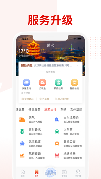 -生活服务:违章查询、快递查询、火车时刻表......我们还有周边商户、景点门票...你还在犹豫什么?快来下载掌上的武汉吧!