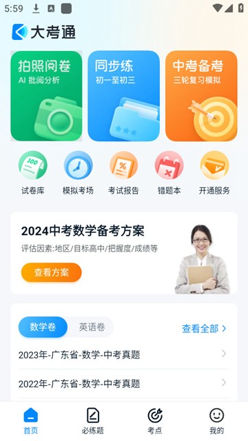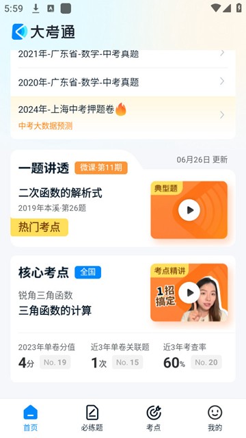 【大考通APP】是一款面向全国中小学生推出的在线学习教育应用,包含同步精讲、错题集、练习册、专题训练营、每日一练等多种模块,