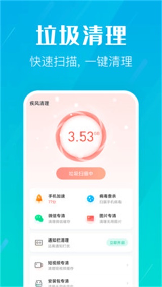 疾风清理手机优化工具是一款超级实用的手机垃圾清理类工具软件,通过软件可以对手机进行深层扫描并释放空间让运行速度更快更好的使用手机,有需要的用户快来下载试一下吧!