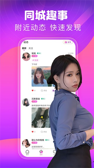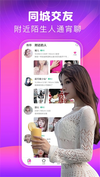 同城甜心交友约会单手机app是一款非常火爆的同城相亲软件,同城恋爱交友约会单手机app是为用户们提供了一个线上线下交流平台,在这里面你能找到各种各样的单身人士和帅哥美女来聊天互动,帮助你快速脱单。