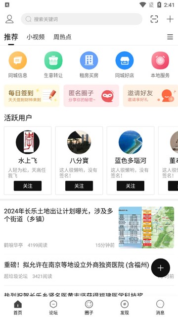 长乐区综合性论坛app是福建省长乐区综合性论坛官方推出的手机客户端。该软件提供了长乐区最新最热的资讯,用户可以在这里了解本地生活动态、美食推荐、求职招聘以及房屋租赁等各种服务信息等等;同时还提供便捷的生活消费入口和社交圈子功能让大家在同城生活的方方面面得到极大地方便了。