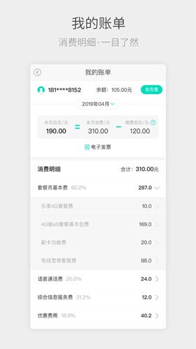 3.“我的账单\":支持查账单详细详情分析,包括账目清晰明了!