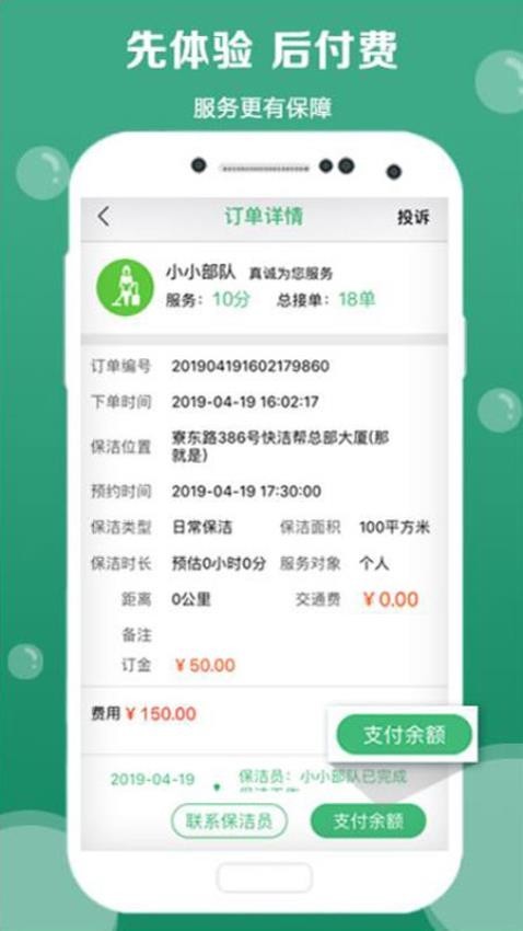 1、便捷:操作简单轻松使用,无需复杂设置就能快速找到所需的服务项目和服务信息。2、安全:严格的信息审核机制确保每位用户的隐私保护,保证了每一个交易的安全性和可靠性。3、个性化推荐:根据您的需求推送适合您的服务内容,让生活更加高效有趣。所有的服务费用明码标价一目了然,帮助您做出明智的选择。5、在线预约:可提前预定服务时间,省去了排队的时间,提高了工作效率。快洁帮app亮点