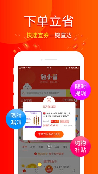 包小省是网购达人必备的应用之一,拥有海量隐藏大额优惠券以及各大电商平台的独家优惠力度,