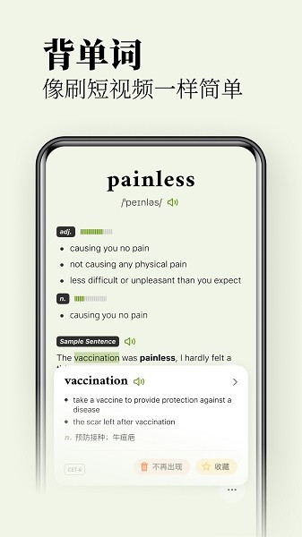 -通过闯关的方式将单词按照难度进行分类,分为四级、五级的难度等级,每个难度阶梯内置大量适合不同水平的单词卡片,满足不同阶段用户的需求。