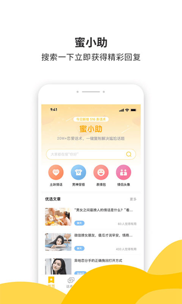 蜜小助恋爱话术软件是一款专为广大在校大学生打造的恋爱聊天助手,拥有上千万的恋爱话术库和实战案例分析。在这里汇集了大量的恋爱技巧攻略内容供用户进行参考学习使用,能够快速提升你的聊天交友能力以及脱单成功率,让你可以更好的应对各种场合!