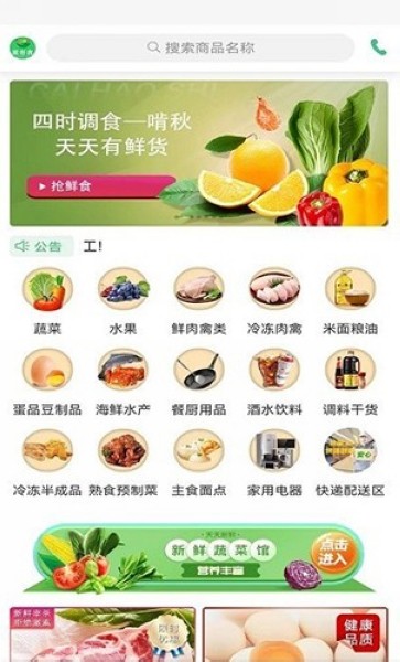 菜好食是一款十分优质的生鲜食材购物软件,在这里你可以购买到新鲜绿色健康的蔬菜水果,并且这里的产品种类丰富多样,不管是时令蔬果、米面粮油还是海量肉蛋禽鱼都可以轻松下单选购。