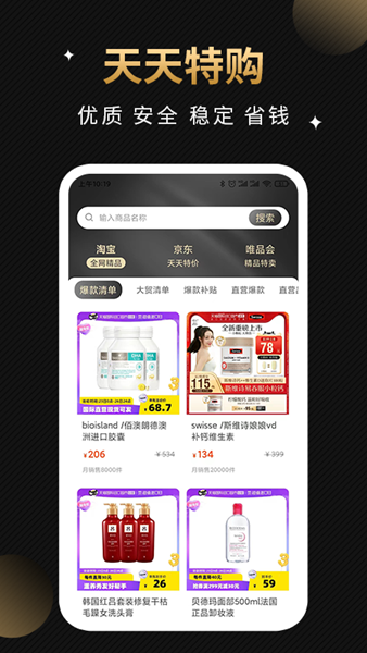《淘宝特购》是国内最大,最实惠的手机购物应用。天天特购app拥有海量的优惠信息、促销活动与生活服务资源供你选择体验。全场低至1元包邮,每日限时抢购,超值好货低价购,买买买不再剁手;天天特购app还有超多优惠券等着你来拿,随时领券下单省钱,比直接下店铺便宜一半以上的。天天特购app致力于为广大用户提供一站式在线网购的服务平台,天天特购app为你提供了多种类型的生活消费品及周边旅游美食产品,