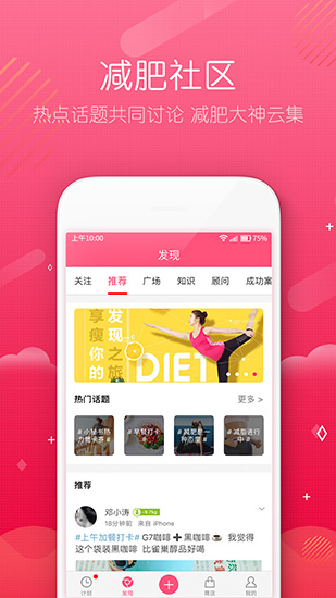5.“社区讨论区”。在这里找到一群爱好减肥的小伙伴,互相鼓励,一起进步,一起瘦;也可以跟别人比拼成果,相互勉励。