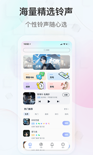 趣铃是重庆恒奇峰信息服务中心推出的一款非常实用的手机软件,该软件拥有海量的热门歌曲资源供你选择。在这里用户可以找到非常多的优质音乐来为自己进行设置使用,并且还有各种炫酷壁纸等着你前来下载体验!